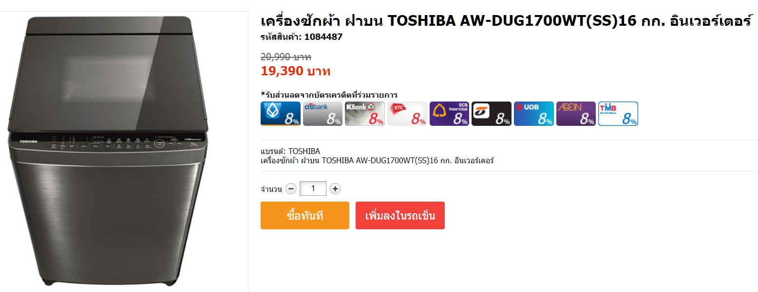 ของ TOSHIBA รุ่น AW-B1000GT กับ LG รุ่น WF-T1176TD ข้อมูลจำเพาะ - TOSHIBA รุ่น AW-B1000GT 9 กก ข้อมูลจำเพาะ - LG รุ่น WF-T1176TD 11 กก คือเรื่องของเรื่องมันอยู่ที่ว่าผ่อนจ่ายต่อเดือนเป็นเงินเบาๆด้วย
