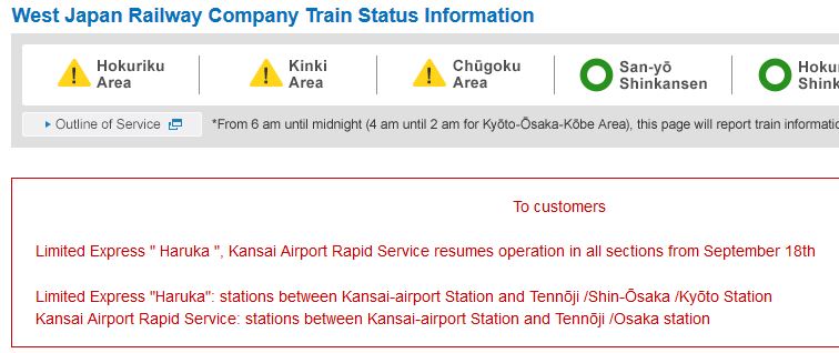 = Train : Kansai Airport <===> Osaka มีแผนเริ่มกลับมาวิ่งวันที่ 18 กันยายน