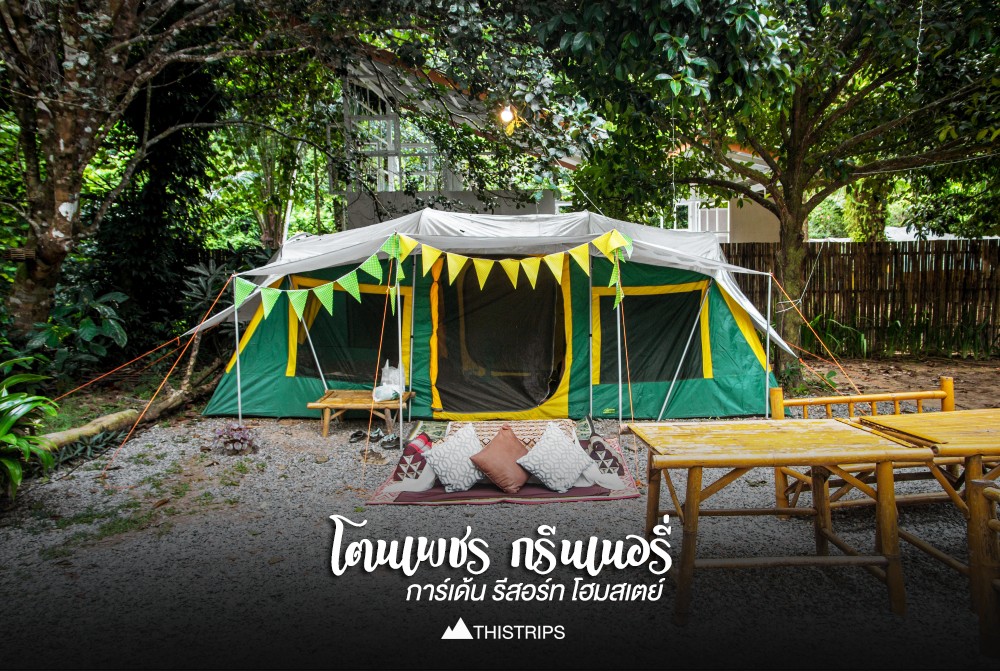 ที่พักในครั้งนี้เราเลือกจองที่ โตนเพชร กรีนเนอรี่ การ์เด้น รีสอร์ท โฮมสเตย์เล็กๆ กลางสวนที่เงียบสงบ เหมาะกับการมาพักผ่อน เราอยากมาที่นี่นานแล้วตั้งแต่ได้เห็นรูปถ่ายครั้งแรก เราเลือกพักเตนท์ใหญ่ทั้งสองคืน แม้จะเป็นเตนท์แต่ก็สะดวกสบายมากๆ และอากาศก็ไม่ร้อนเลย มีบริเวณหน้าบ้านด้วยนะ มื้อเย็นที่รวมในค่าที่พักเป็นซีฟู้ดปิ้งย่าง มาเสิร์ฟให้ถึงหน้าเตนท์เลย