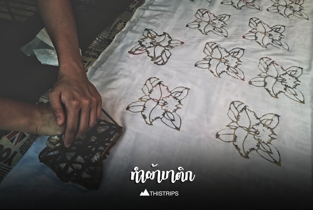 เริ่มจากการปั๊มเทียนลงบนผ้า ซึ่งส่วนที่มีเทียนนี้จะไม่โดนสีย้อม พอล้างออกก็จะเห็นเป็นเส้นสีขาวบนพื้นสี