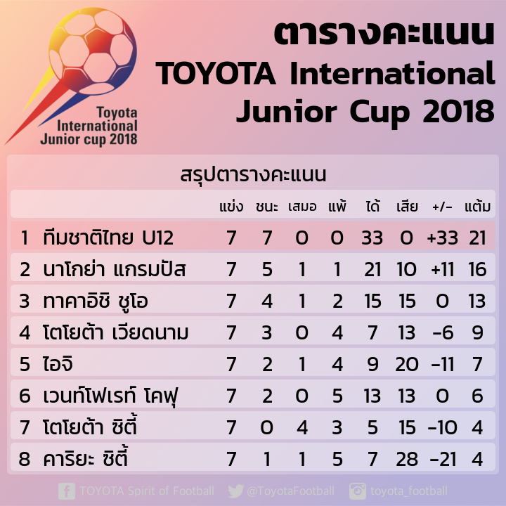 ตารางคะแนนรายการ TOYOTA International Junior Cup 2018 U12
