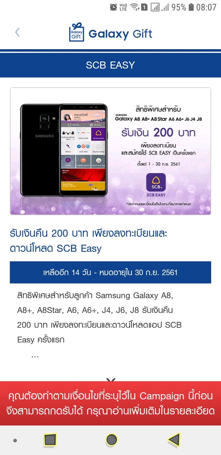 คำถามคือคลิกลิ้งจาก line scb มันลิ้งไป galaxy gift แล้วต้องลงทะเบียนก่อนถึงจะไปโหลด app scb easy ใช้ครั้งแรกเพื่อรับเงิน 200 บ. คือใช้รุ่น galaxy a6 มันต้องไปลงทะเบียนตรงไหนครับ