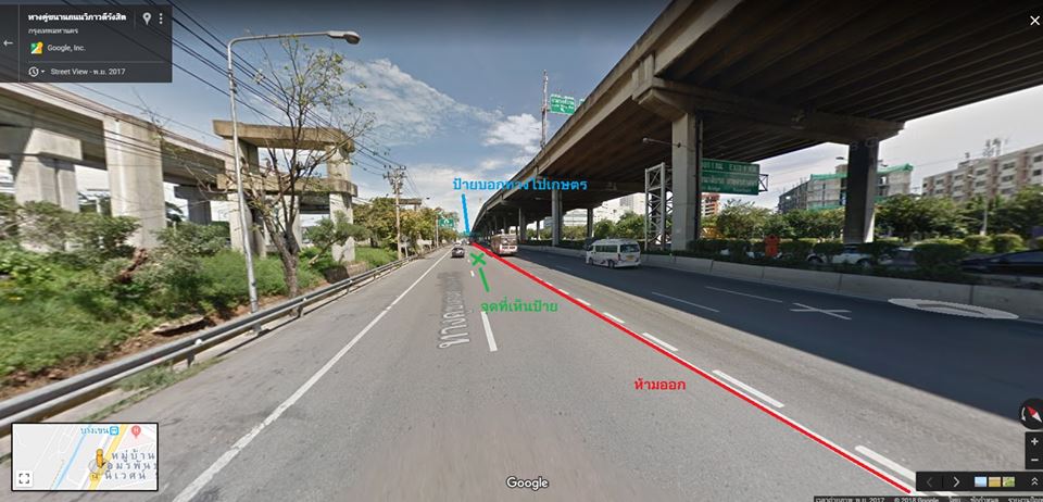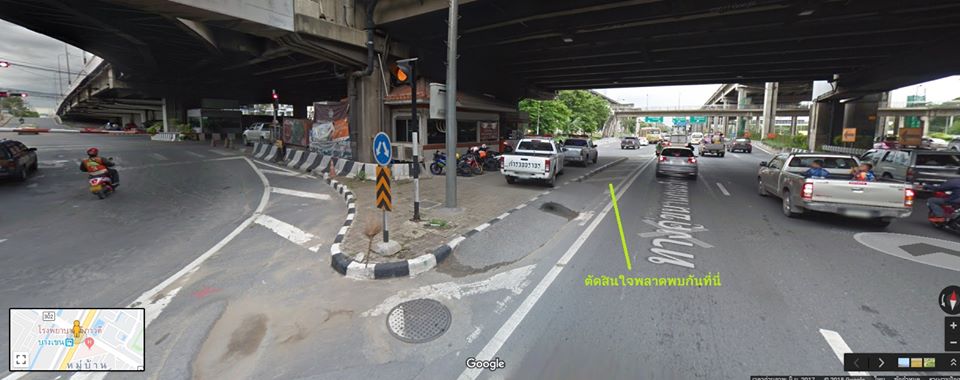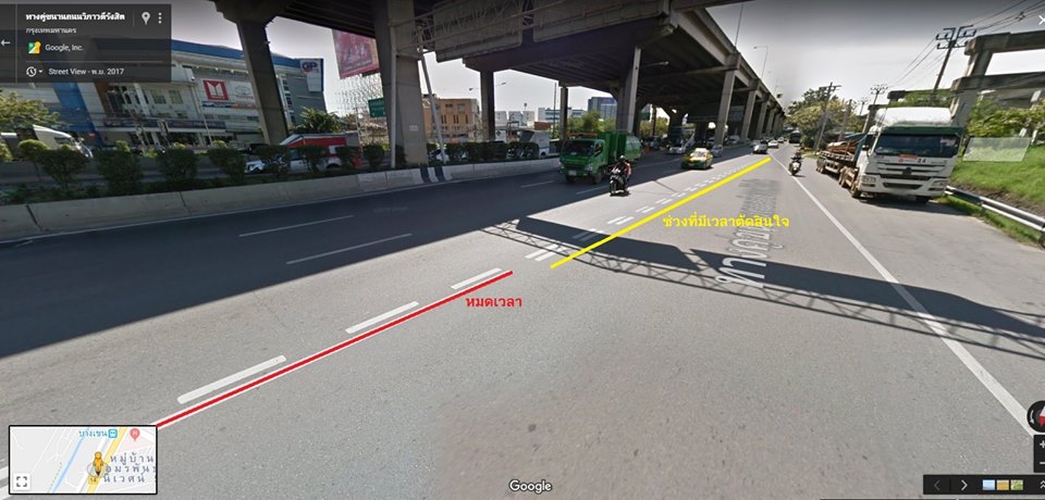 วันนี้ผมขับรถออกจากช่องทางด่วน มายังคู่ขนานวิภาวดีรังสิต แถวๆดอนเมืองตามปกติ ซึ่งช่องทางออกจะมีเส้นปลอดภัยดังรูป ผมก็เห็นว่ามีเส้นปลอดภัย เลยขับออกมาโดยไม่ได้มองทางซ้าย ปรากฎมีรถคันหนึ่ง วิ่งเหยีย