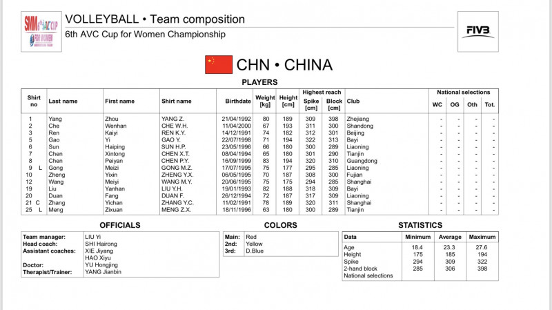 ประกาศรายชื่อ14คน ทีมจีนลงเล่นAVC Cup 2018 1.Chen XinTong -1994-178 (S) 2.Sun Haiping - 1996 - 180 (S) 3.Wang Meiyi - 1995-190 4.Chen PeiYan - 1999 - 193 5.Liu Yanhan - 1993-188 6.Zhang YiChan- 1