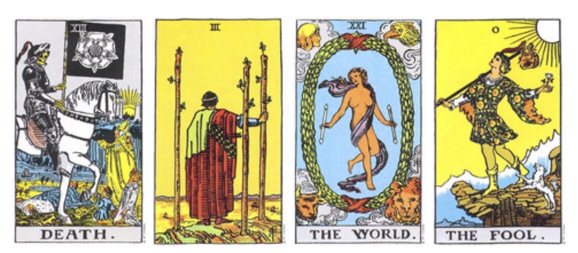 ไพ่ขึ้นมาแบบขัดแย้งคะ (ใบที่ 1 The Fool ใบที่ 2 The Death ใบที่ 3 The World) พยายามหาแปลเองแล้วค่ะ แต่หาความเชื่อมโยงไม่ได้... (+_+)a ปล. ไพ่ทาโรต์ ดูดวง 3 ใบ ในอินเตอร์เน็ตค่ะ มะรุว่า Random จริงป่