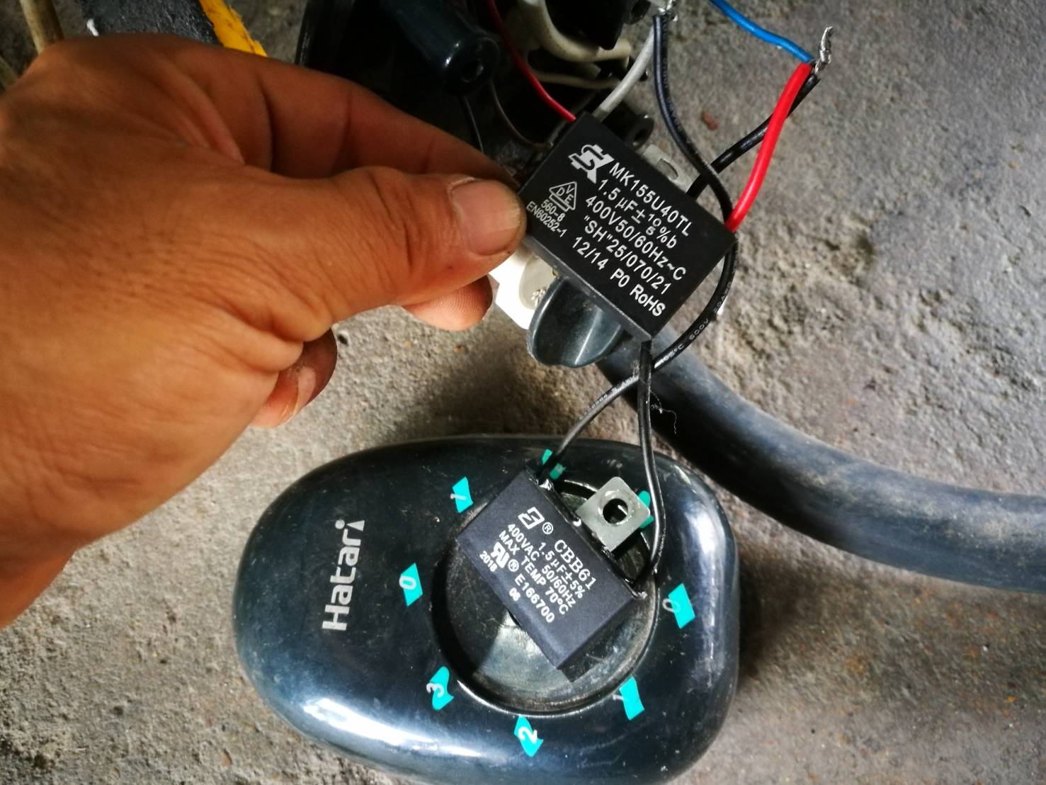 อีกกรณีคือเจ้าพัดลมตัวใหญ่ที่ค่าตัว c 2.5 เสื่อม ผมลองนำตัว c ค่า 1.5 ตัวใหม่ที่ซื้อมา มามัดรวมกับตัว c 1.5 ของเก่าที่เสื่อมแล้ว
