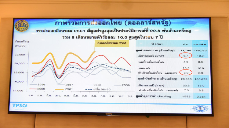 ส่งออกเดือน ส.ค. โต 6.7 % ต่อเนื่องเป็นเดือนที่ 18 มูลค่าสูงสุด 22.8 หมื่นล้านดอลลาร์