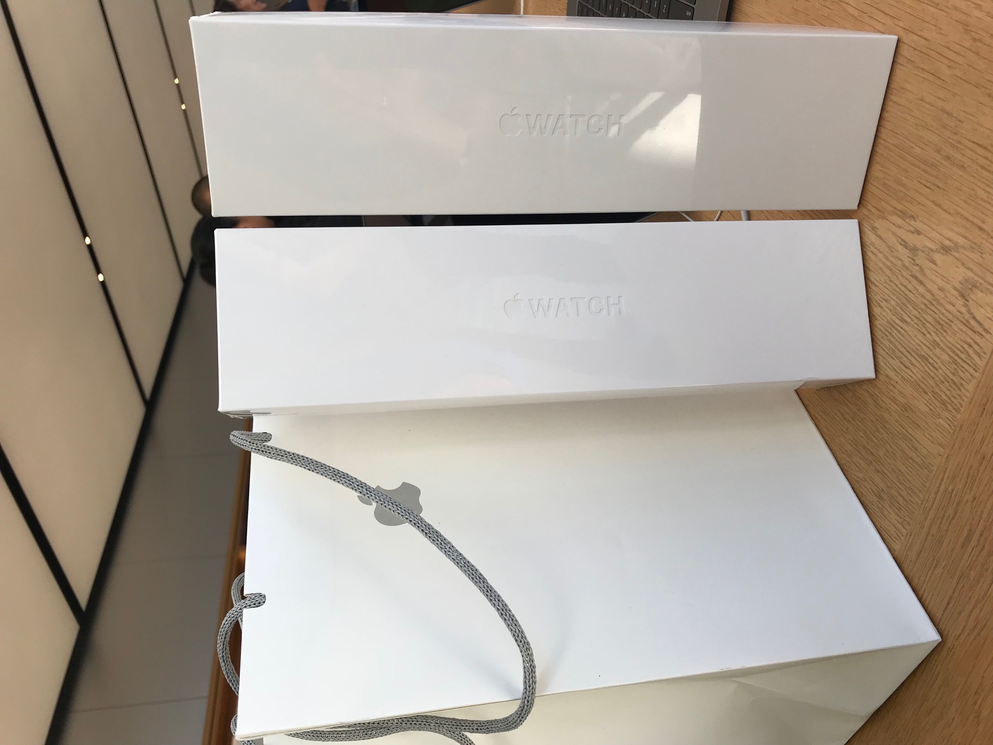 หลังจากที่ผู้โชคดี 15 ท่านแรกเดินเข้าไปใน Apple Store กันเรียบร้อย แถวสองรอเสียบอย่างพวกเราก็ยืนกินขนมจิบกาแฟนางเงือกเขียวรอกันไปก่อนครับ รอกันนานพอควร ภาพตัดมาที่ 9.00น. ตามเวลลาที่ระบุไว้ในใบลงทะเบียนก็มี จนท.หนุ่มน้อยมาต้อนรับและเชิญเราเข้าไปภายใน Apple Store ครับ สอบถามสารทุกร์สุกดิบกันตามมารยาท แล้วก็ถามหาบาร์โค้ดที่เราได้รับตอนลงทะเบียนเมื่อเช้าทันที ผมยื่นให้ แล้ว จนท.ก็หายไปหลังร้านไม่ถึง 5 นาทีก็กลับออกมาพร้อมกับสินค้าที่เราเลือกที่จะซื้อเอาไว้ นั่นก็คือ แทน แทน แท๊น....Apple Watch Series 4 GPS สีทองกับสีเทาดำครับผม