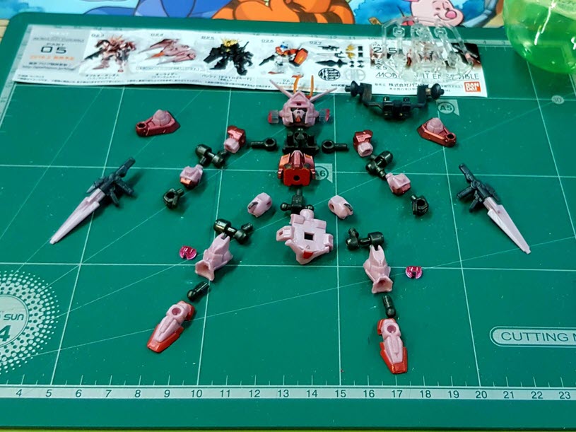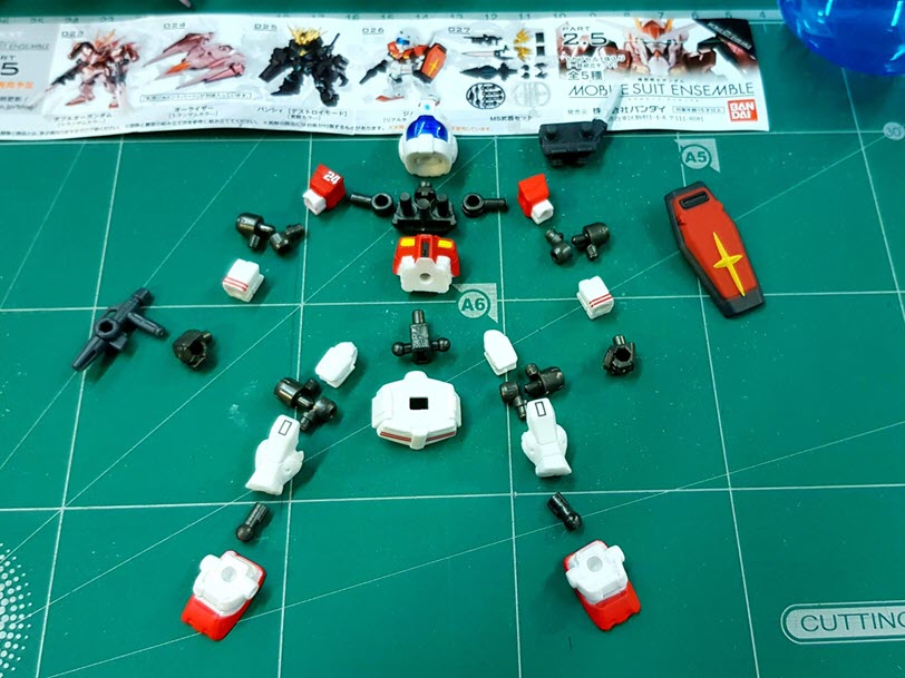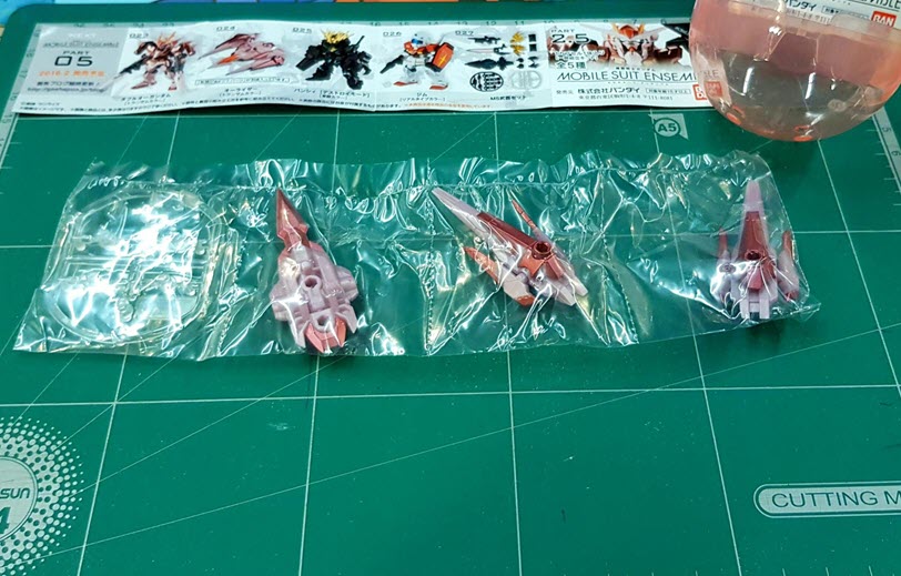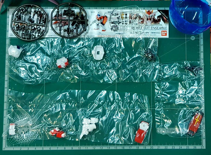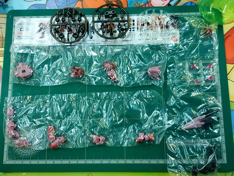 ลำดับต่อมาครับแคปซูลสีน้ำเงิน เปิดออกมาจะพบกับชิ้นงานของ GM ในแคปซูลจะมีชิ้นงานใส่มาในซองพลาสติก 3 ห่อ และชิ้นงานที่ไม่ได้บรรจุในห่อแต่อยู่ในแคปซูลด้วยกันนั้นจะมี แผงข้อต่อ 2 แผง ขาตั้งหรือ Action Base 1 แผง