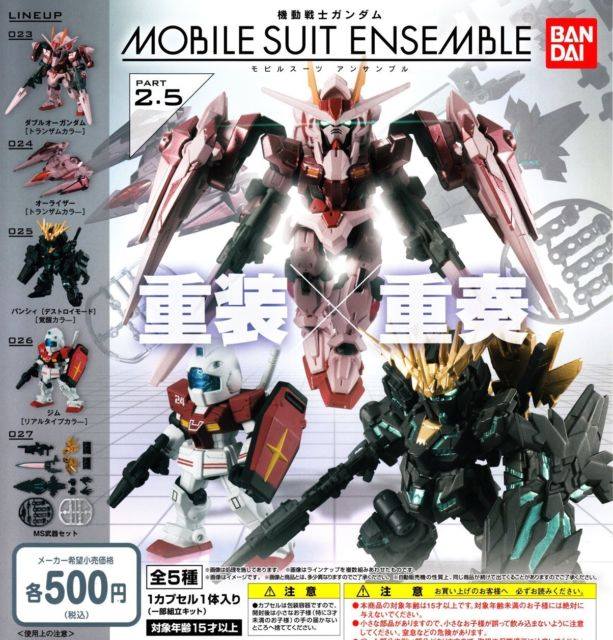 สำหรับในชุดนี้ Mobile Suit Ensemble 2.5 เลขชุดค่อนข้างสื่อความหมายชัดเจนคือนำ design หุ่นจากในชุด Mobile Suit Ensemble 02 มายกชุดเลยแล้วนำมาเปลี่ยนสี ในชุดนี้ตัวเด่นคือ Gundam OO และยาน O Rasier ซึ่งมีสีในโหมด Trans-am พร้อมทั้ง Banshee จากกันดั้มซีรีย์ Gundam Unicorn ในโหมดสี Awakening และ GM Real type color ในชุดประกอบด้วย 5 แคปซูล ราคาจำหน่ายแคปซูลละ 500 เยน และกำหนดวางจำหน่าย ธันวาคม 2017 ในชุดประกอบด้วย