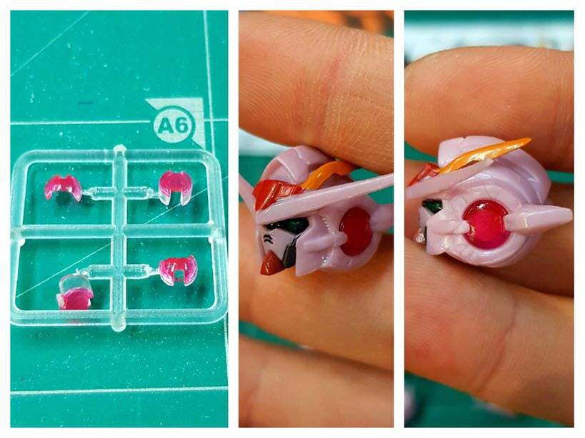 OO Gundam มีลูกเล่นพลาสติกสีใส ๆ ให้ติดที่ส่วนหัวและขา โดยชิ้นใสจะมาในแผงยึดพลาสติก