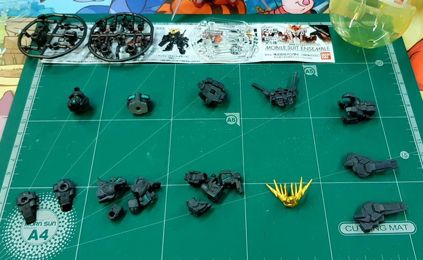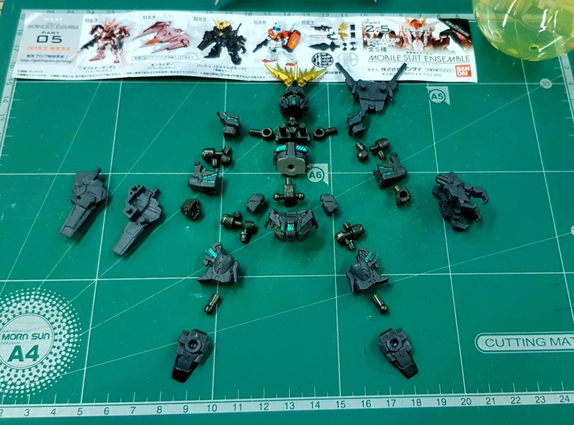 ลำดับต่อมาครับแคปซูลสีเหลือง เปิดออกมาจะพบกับชิ้นงานเพื่อใช้ประกอบเป็น Banshee ในแคปซูลจะมีชิ้นงานใส่มาในซองพลาสติก 3 ห่อ และชิ้นงานที่ไม่ได้บรรจุในห่อแต่อยู่ในแคปซูลด้วยกันนั้นจะมี แผงข้อต่อ 2 แผง ขาตั้งหรือ Action Base 1 แผง