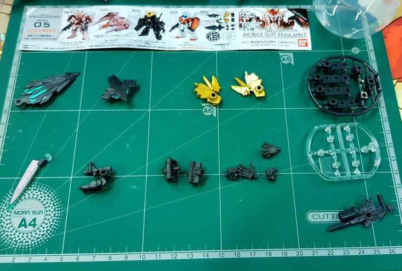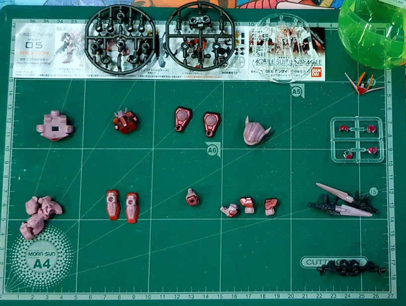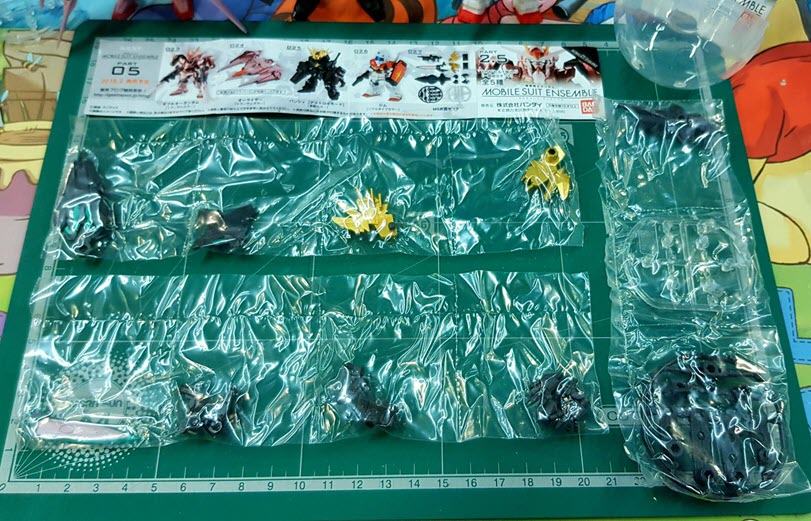 เริ่มแคปซูลแรกกันเลยดีกว่าครับกับแคปซูลสีเขียว เมื่อเปิดออกมาจะพบชิ้นงานเพื่อใช้ประกอบเป็น OO Gundam ในแคปซูลจะมีชิ้นงานใส่มาในซองพลาสติก 3 ห่อ และชิ้นงานที่ไม่ได้บรรจุในห่อแต่อยู่ในแคปซูลด้วยกันนั้นจะมี แผงข้อต่อ 2 แผง ขาตั้งหรือ Action Base 1 แผง