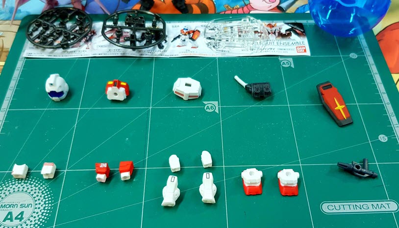 แคปซูลลำดับสุดท้ายในชุดนี้ครับ ชุดอาวุธและพาร์ทเสริมในแคปซูลสีขาว เมื่อเปิดออกมาจะพบกับชิ้นงานบรรจุในซองพลาสติก 3 ห่อ