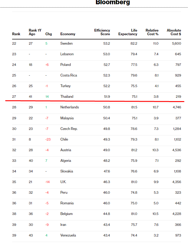 การรักษาพยาบาลของไทยปรับขึ้นมาดีที่สุด กระโดดขึ้นมา 14 อันดับอยู่ที่ 27 (จากเดิมที่ 41)