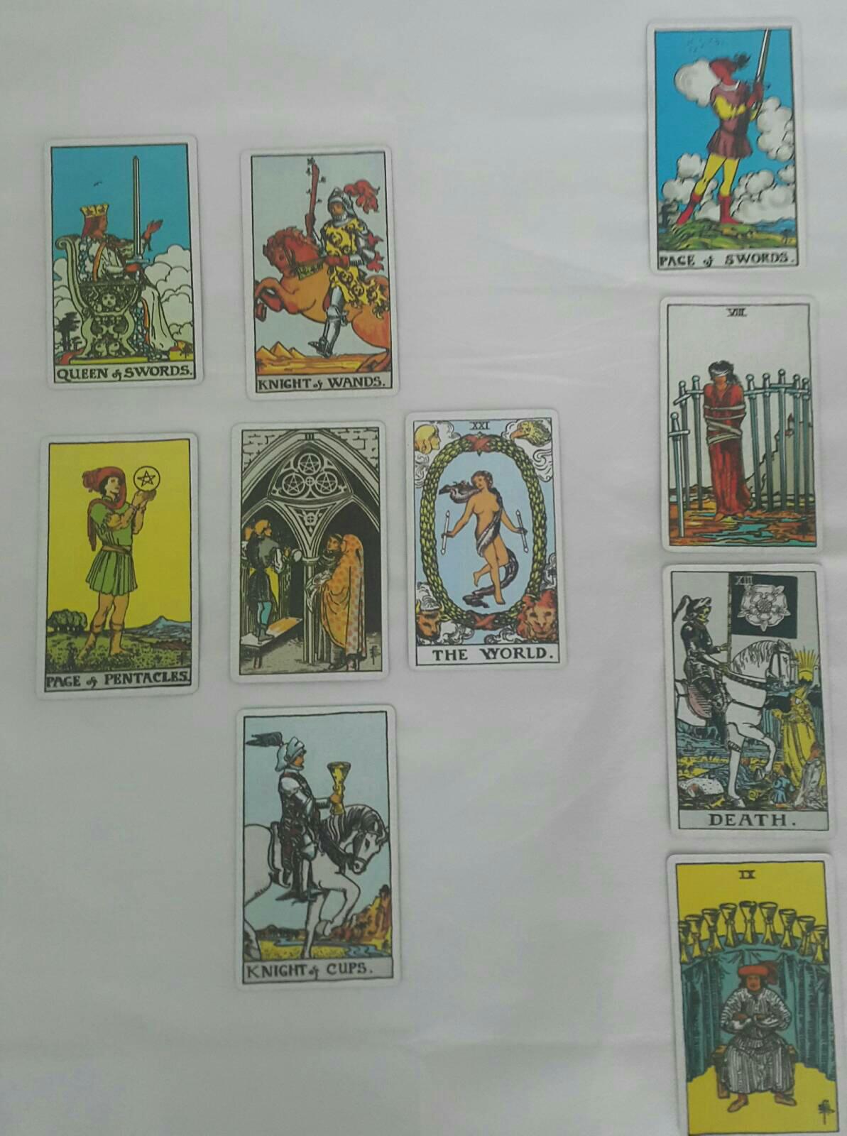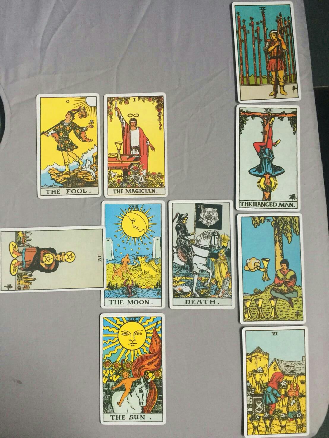 1.THE TWO OF CUPS2.ACE OF SWORDS3.THE TWO OF WANDS4.ACE OF CUPS5.THE THREE OF SWORDS6.The Emperor7.THE SEVEN OF SWORDS8. THE FIVE OF WANDS9. The Chariot10.THE PAGE OF PENTACLES รบกวนแปลความห