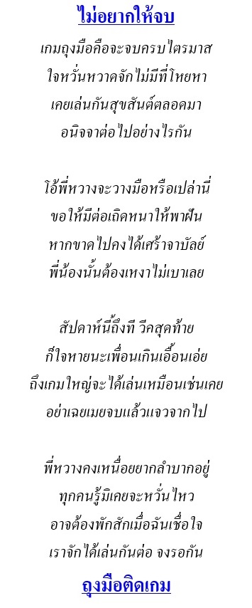 พรรณนาเรื่องเกมถุงมือของเราว่าถึงคราวที่จะจบแล้ว และแม้จะมีเกมใหญ่ต่อ แต่หลังจากนั้นล่ะ กรรมการจะอะไรยังไงต่อ และดักคอว่าคงจะพักก่อนละมั้ง กับแสดงความหวัง (เหมือนขอ) ว่า เกมจบแล้วอย่าจากกันไปนาน...เราคงได้เล่นกันอีก ประมาณนั้น...