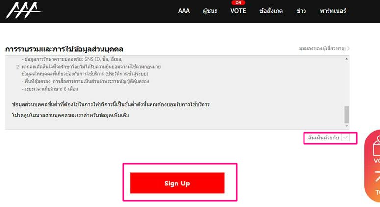 แต่พอพ้นผ่านหน้านี้ได้เราก็จะมาเจอหน้านี้ เลยเราก็กดไปเลย เห็นด้วย เห็นด้วย ทั้ง 2 อันแล้วเราก็มากด Sign up ได้เลย
