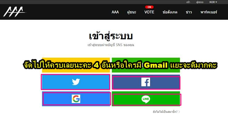 ทั้ง Line , Facebook , twitter และ Gmail คะ แต่ละไอดีจะสามารถโหวตได้ 5 ครั้งต่อวัน