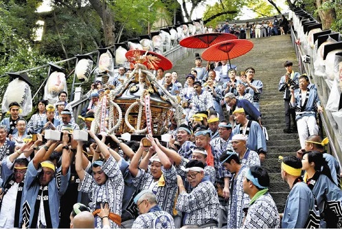 โดยงานเทศกาลจะจัดขึ้นสองปีครั้ง ทว่าเมื่อครั้งก่อนการแบกศาลเจ้าน้อยขึ้นลงต้องระงับไปเพราะบันไดหินเปียกมากเนื่องจากฝนตก นี่จึงเป็นการจัดงานขึ้นอีกครั้งนับแต่ปี ค.ศ.2014 ท่ามกลางเสียงโห่ร้องและเสียงกลองไทโกะที่ดังกระหึ่ม ผู้คนสวมเสื้อฮัปปิต่างก้าวเดินด้วยความระมัดระวังพร้อมกับรักษาสมดุลในการแบกหามศาลเจ้าหลังน้อย
