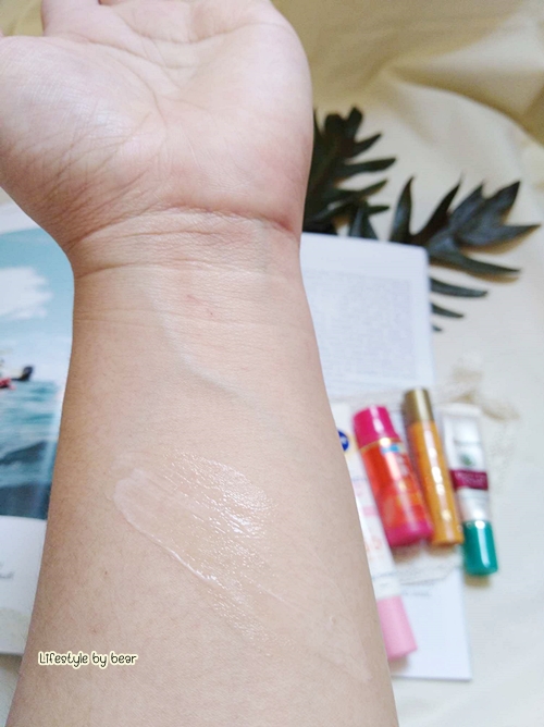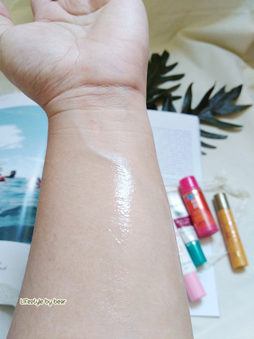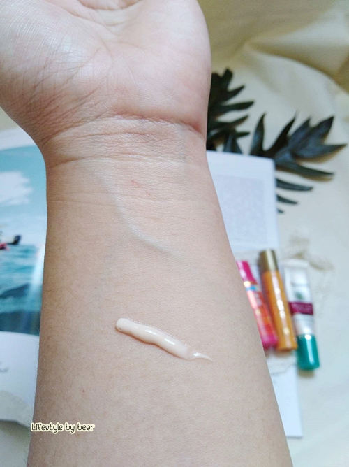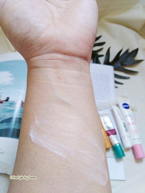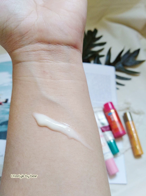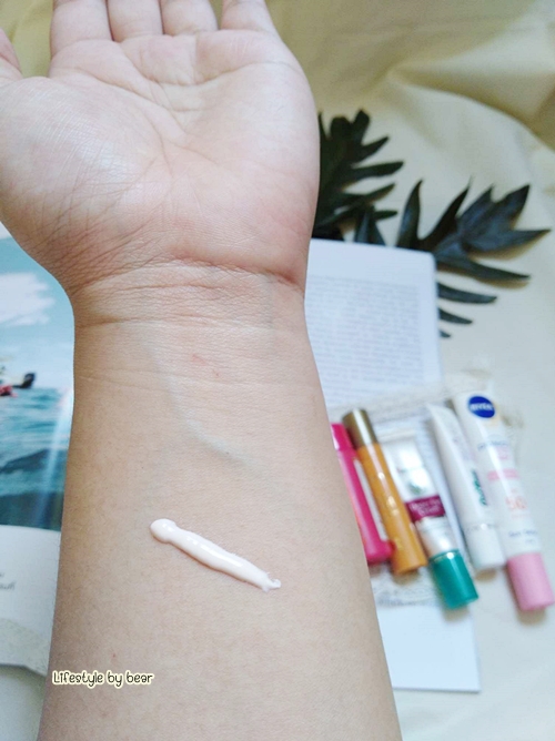 ลักษณะเนื้อผลิตภัณฑ์ : เป็นเนื้อสีขาวอมชมพูหน่อยๆ กลิ่นหอมดีนะ เนื้อบางเบามากเป็นกันแดดที่ควรมี ทาแล้วสบายหน้ามาก