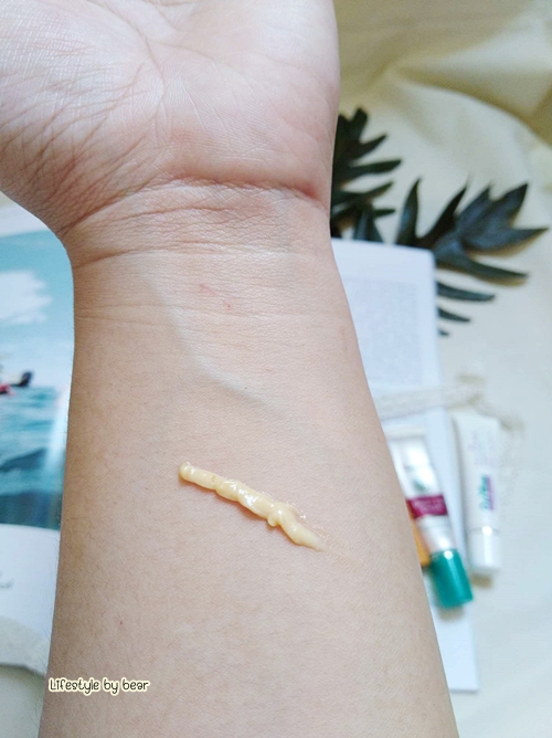 ลักษณะเนื้อผลิตภัณฑ์ : เนื้อครีมของเค้าจะเป็นครีมสีเหลืองอ่อนๆ กลิ่นไม่ฉุนนะ ออกกลิ่นเหมือนยาหน่อยๆ เมื่อเกลี่ยลงผิวแล้วรู้สึกบางเบาซึมง่าย ไม่เหนียวเลย สามารถลงครีมบำรุงหรือกันแดดต่อได้เลย