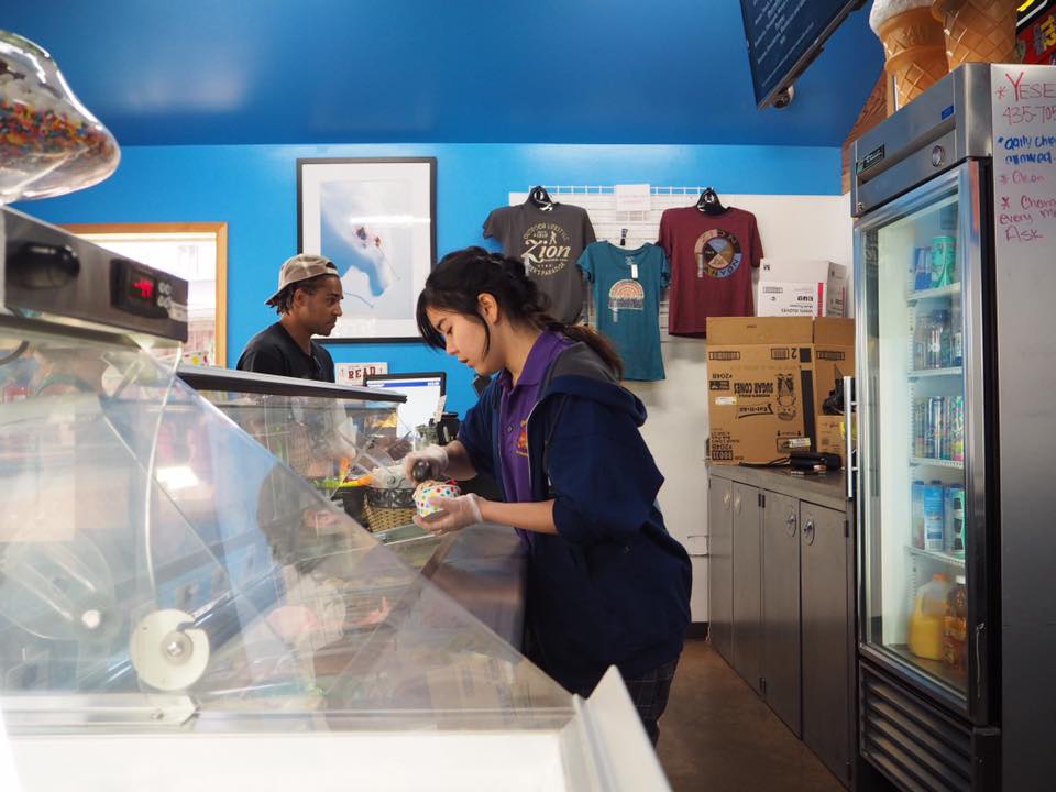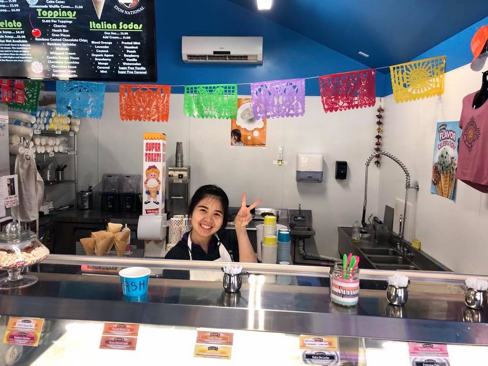 เรื่องการทำงานกันบ้างนะคะ หน้าที่หลักก็คือขายไอศกรีม สมูตตี้ และเมนูของหวานที่เรามีในร้าน ซึ่งพนักงานจะมีทั้งหมด 2 คนค่ะ ร้านไม่ใหญ่มาก ไม่มีเมเนเจอร์ หรือนายจ้างเข้ามาเท่าไหร่ แทบจะเรียกได้ว่าเค้าปล่อยให้เราจัดการกันเองในร้านนั่นแหละค่ะ แต่ข้อควรระวัง แม้ว่าร้านของหวานลูกค้าจะน่ารักใจเย็นก็ตาม แต่จะเต็มไปด้วยเด็กๆ ที่วุ่นวายมากถึงมากที่สุด เราต้องพยามตักให้สวย และเท่าๆกันด้วยนะคะ ไม่เช่นนั้น เคยมีเหตุการณ์ที่เพื่อนฝรั่งนางทำบานานาสปริดไม่เหมือนกันให้ลูกค้า เด็กร้องไห้เลยค่ะ และพ่อแม่ก็ไปโวยกับเมเนเจอร์ที่นั่งอยู่ใน Hoodoos ที่ติดกับร้านเรานั่นเอง ยิ่งเราทำสวย ลูกค้าก็ยิ่งว้าว และมีความสุขนะคะ ^^
