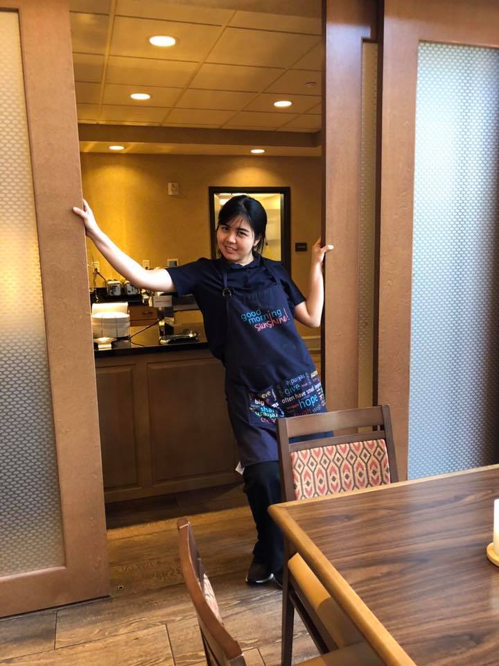 เราเองแหละจ้า ทำห้องอาหารเช้าที่ Hamptan Inn by Hilton งานหนักและต้องเร็ว ทำกาแฟ ดูแลบริเวณห้องอาหาร เติมอาหาร คอยตอบคำถามลูกค้า แต่เราชอบงานนี้นะคะ เหนื่อย แต่สนุก และเมเนเจอร์รักเรามากๆ คอยแพ็คอาหาร ผลไม้ให้กลับบ้าน คอยหาชั่วโมงงานเพิ่มให้ตลอดเลยค่ะ เพราะเราชอบบ่นให้ฟังว่างานแรกชอบให้ออกไปเบรก เพราะไม่ให้โอที ทั้งที่ร้านวุ่นวายมากๆ แถมเงินก็น้อยมากๆด้วย