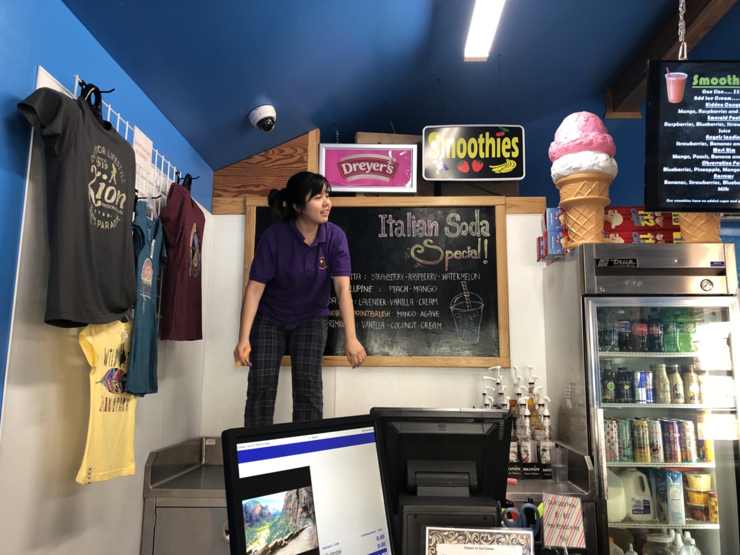 เวลาเริ่มงานของเราจะตายตัวอยู่ที่ 1 pm – 9 pm เป็นเวลาร้านเปิดปิด ซึ่งอาจจะล่วงเวลาเป็นการเก็บร้านถ้ายุ่งมากๆอีกครึ่งชั่วโมง หรืออาจจะเร็วกว่านั้นค่ะ โดยหน้าที่หลักของเราก็จะเริ่มจากเปิดร้าน ขนไอศกรีม ดูแลแคชเชียร์ ค่อยดูแลร้านให้สะอาด ทำวาฟเฟิลโคน ทำมิลเชค และสมูตตี้ บลาๆ เหมือนจะเป็นงานสนุก แต่เชื่อไหมคะว่า เพื่อนฝรั่งที่ถูกส่งมาทำที่นี่ทุกคนต่างพูดเป็นเสียงเดียวกันว่า “ไม่ ชอบ!” เหนื่องจากเป็นงานที่หนัก และค่อนข้างยุ่งมากๆค่ะ แถมไอศรีมในร้านแข็งมากๆ จนปวดข้อมือ และนอนมือชากันเลยทีเดียว