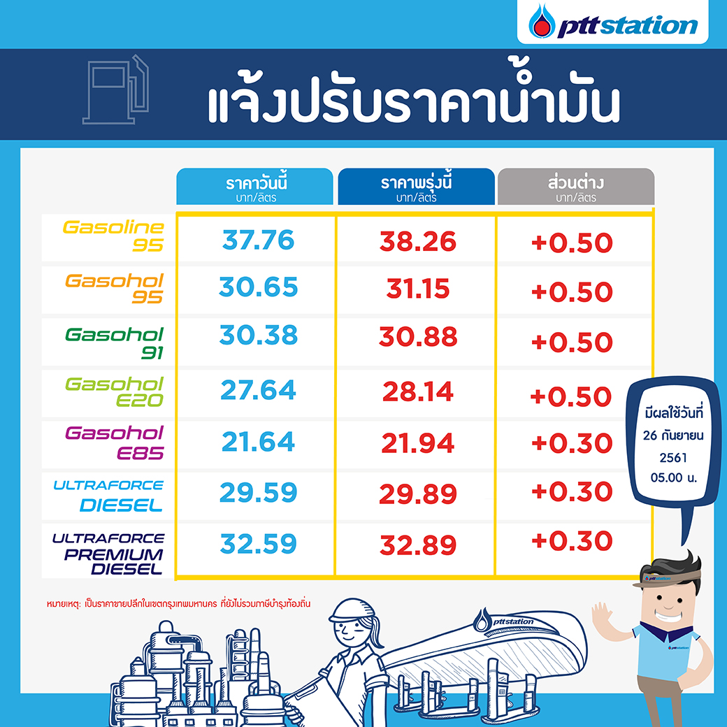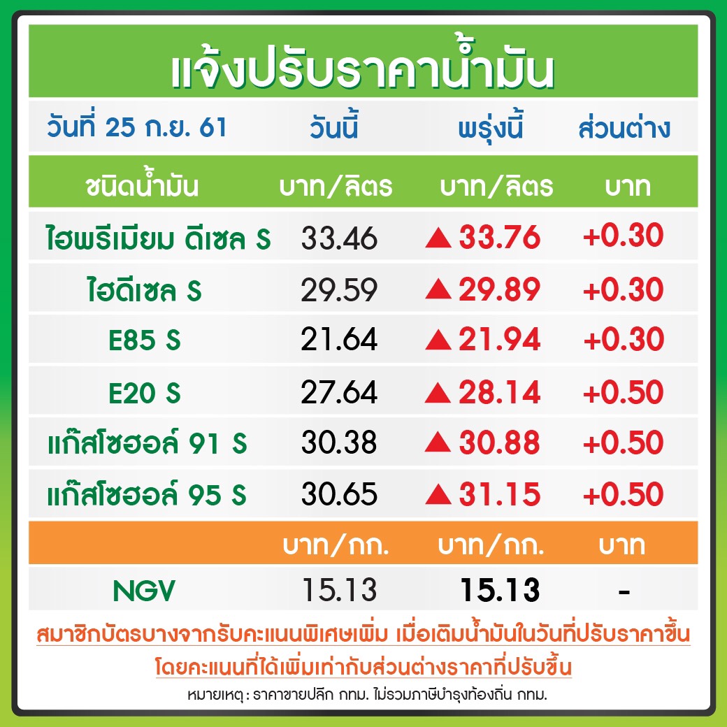 พรุ่งนี้ เจ้าอื่นๆ ก็คงขึ้นตาม (เฉพาะกลุ่มเบนซิน - ดีเซลไม่ขึ้น) วันนี้ ผ่านปั๊ม ปตท. - บางจาก - Caltex และ ESSO ก็เติมเต็มถังได้เลย http://www.eppo.go.th/index.php/th/petroleum/price/oil-price?orde