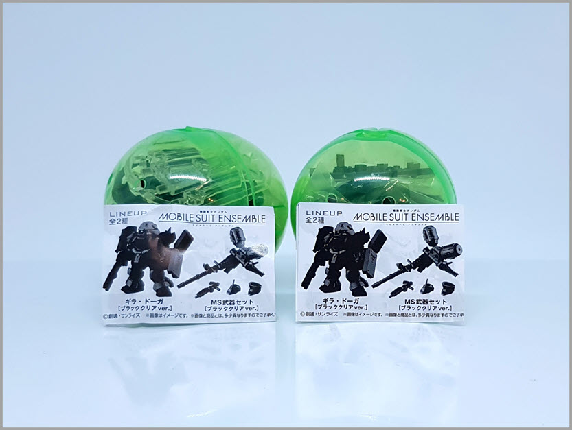โฉมหน้าแคปซูล หรือไข่ที่เราเรียกกันจนคุ้นเคย เป็นแคปซูลมีขนาดเท่ากับ Mobile Suit Ensemble ชุดปกติ แต่ในรายการนี้มีสีเขียวทั้ง 2 ลูกเลยครับ ต่างจากชุดปกติ ที่แต่ละตัวในชุดจะบรรจุอยู่ต่างสีแคปซูลกัน โดยเฉพาะชุดอาวุธและพาร์ทเสริมจะถูกบรรจุมาในแคปซูลสีขาวใส