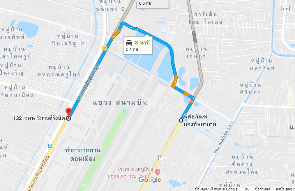 นั่ง BTS มาลง สถานี พิพิธภัณฑ์กองทัพอากาศ แล้วต่อ Taxi โดยให้วิ่งเข้าไปในฐานทัพอากาศดอนเมือง แล้ววิ่งทะลุมาออกวิภาวดี ตามรูป