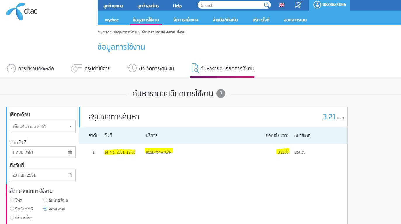 DTAC: โดนหักค่าบริการ Content (USSD for AYCAP)