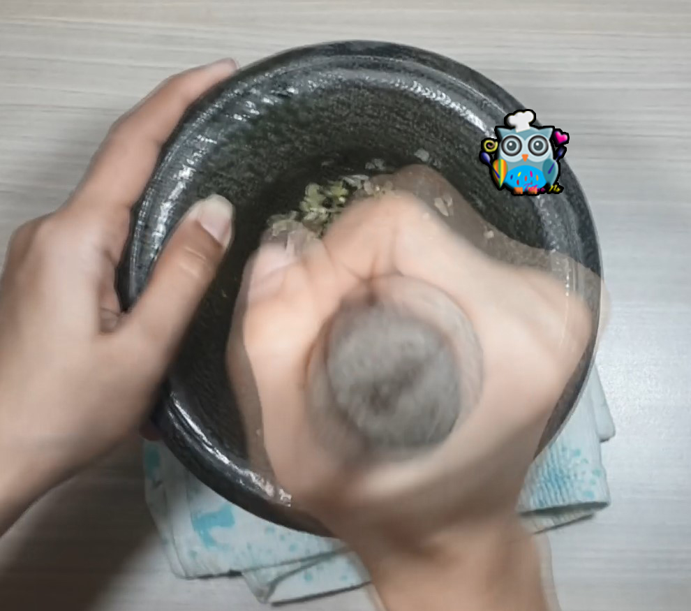3.โขลกสามเกลอ รากผักชี กระเทียมให้เกือบละเอียด ตามด้วยพริกไทยดำบุบๆให้เข้ากัน