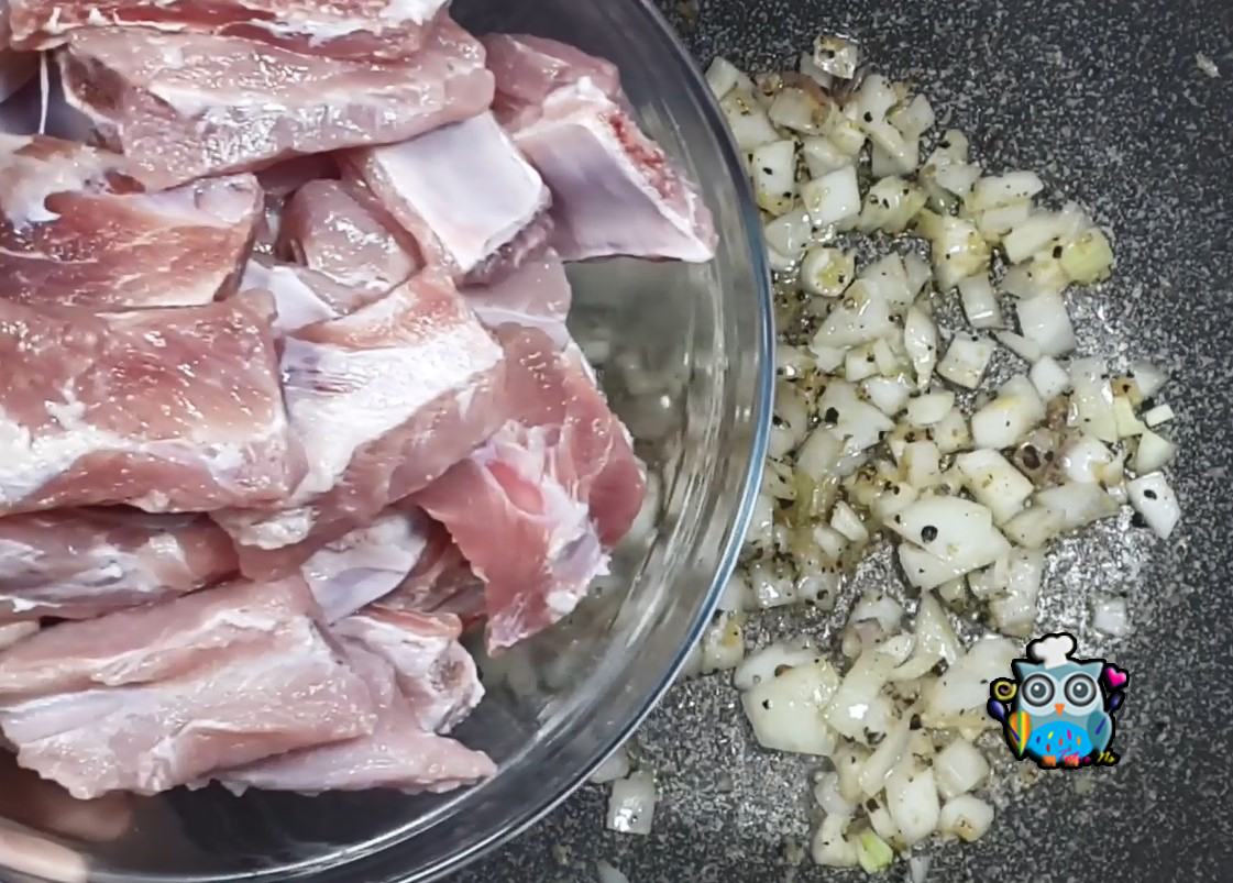 4.ละลายเนยลงกระทะ ใส่หอมใหญ่ลงผัด ตามด้วยสามเกลอ ผัดให้หอม ใส่กระดูกหมูลงผัดให้เนื้อหมูพอตึงๆ