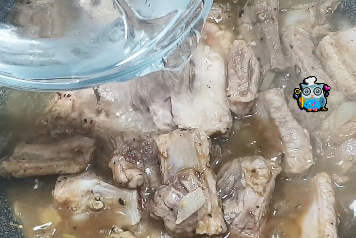 เติมน้ำเปล่าให้ท่วมกระดูกหมู พอเดือดให้ลดไฟลงเป็นไฟอ่อน