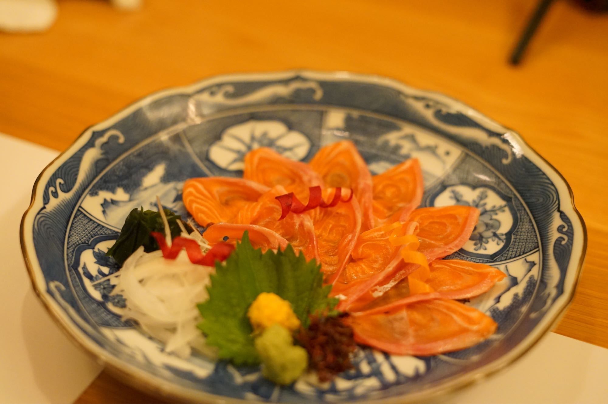 อันนี้นอกคอร์ส ทางร้านเสิร์ฟแซลมอนให้ชิม เป็นแซลมอนที่เลี้ยงโดยผลองุ่นไชน์มัสแคท ลูกละ 60฿!