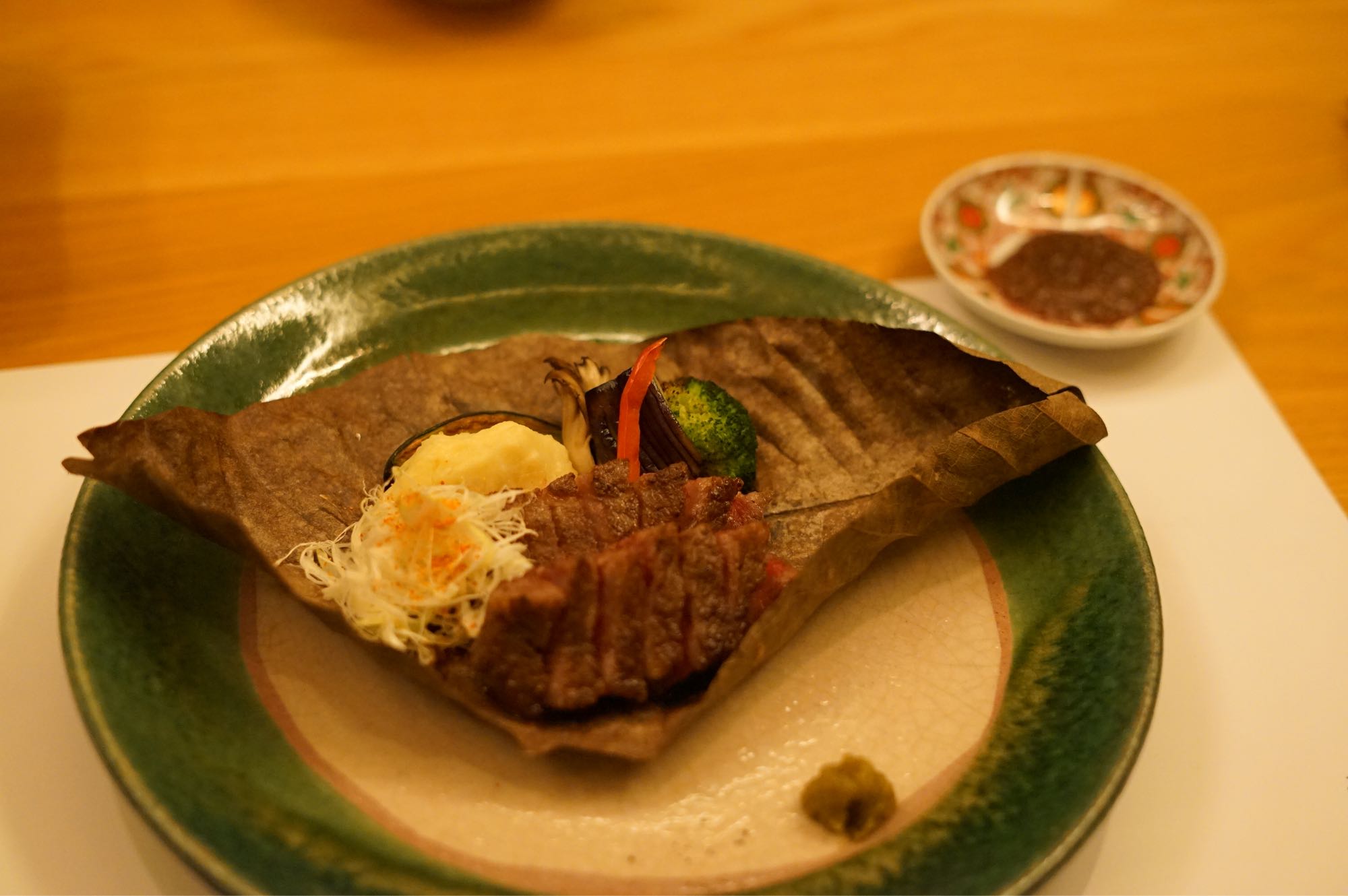 คอร์สของผมเป็นเนื้อย่างบนใบโฮบะ 100กรัม หอมมาก มันแทรกเยอะ กินคู่ยูสุโคโฉะ(ไม่รู้พิมพ์ถูกป่าว) เหมือนพริกไทยเค็มๆ ขับรสชาติออกมาได้ดีขึ้น