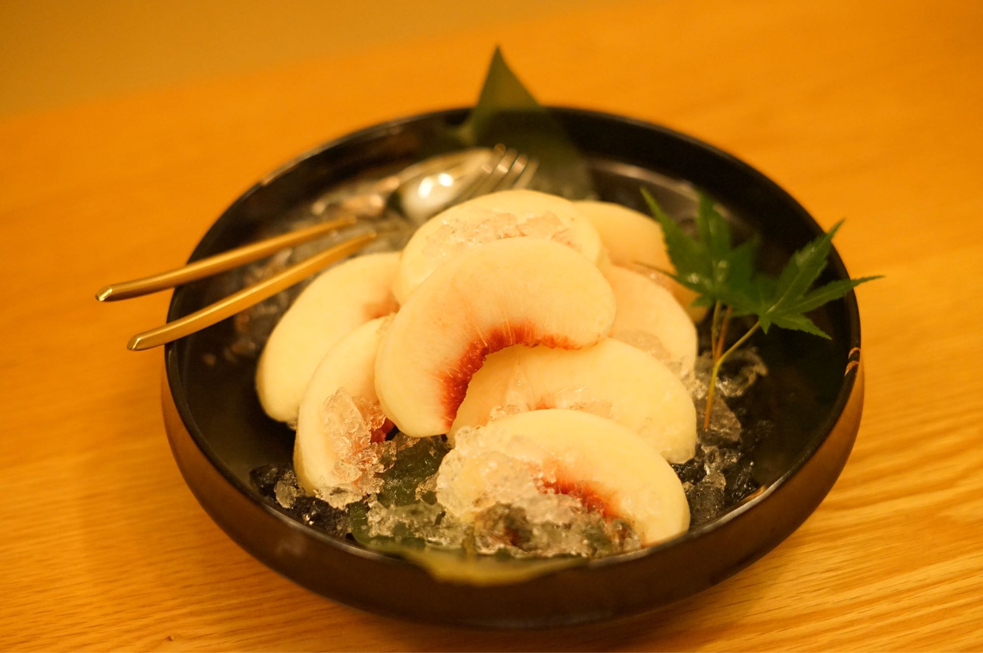 ของหวานในคอร์ส ใสๆนั้นเป็นน้ำจากภูเขาไฟฟูจิ ผสมไวน์ มีกลิ่นแอลกอฮอล์อ่อนๆ ผลไม้ในนั่นมีพีช องุ่นไชน์มันแคท กับเคียวโฮ 3 รสชาติตัดกันมาก