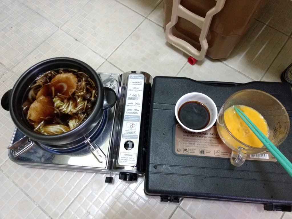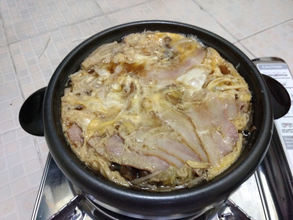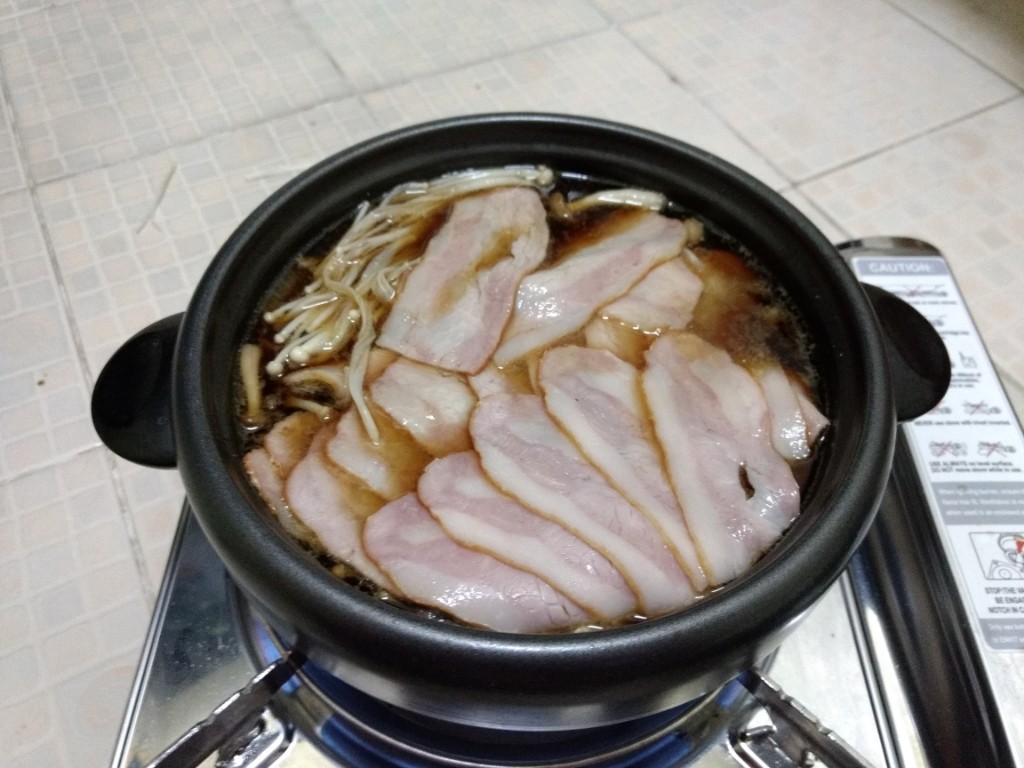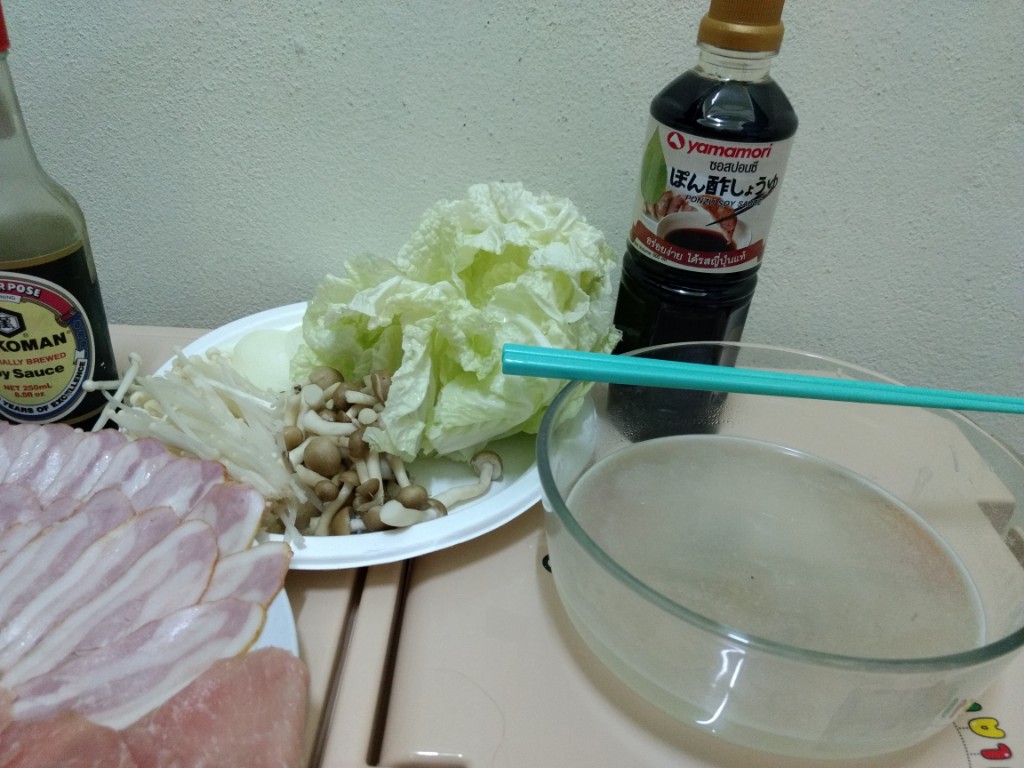 สืบเนื่องจากความขี้เกียจในวันหยุดเพราะแฟนไม่ได้ลงมากรุงเทพเลยไม่ได้ออกไปหาอะไรกินในวันหยุด ก็เลยต้องทำอาหารกินเอง(ปกติแฟนทำให้กิน) ในรอบครึ่งปีก็ลองค้นๆดูว่าพอมีอะไรเหลือในตู้เย็นบ้างก็ได้ออกมาตามนี้ หมูสไลด์จากฟู้ดแลนด์ เบค่อนจากงาน Big C เมื่ออาทิตย์ที่แล้ว ผักกาดขาวเหลือจากกินกับน้ำพริก เห็ดเข็มทองและชิเมจิ ไข่สองใบ หอมใหญ่(ขอป้าที่ตึกเอา) ก็ตัดสินใจทำเมนูสุกี้ญี่ปุ่นน้ำดำสูตรที่แม่ชอบทำเวลากินเหล้าสมัยก่อน(ปัจจุบันเลิกไปแล้ว) โดยในห้องก็มีเครื่องปรุงที่พร้อมใช้เช่น โชยู น้ำตาล เหล้า เนย และผงซุปอยู่แล้ว