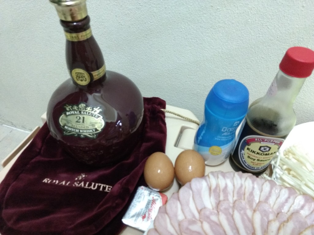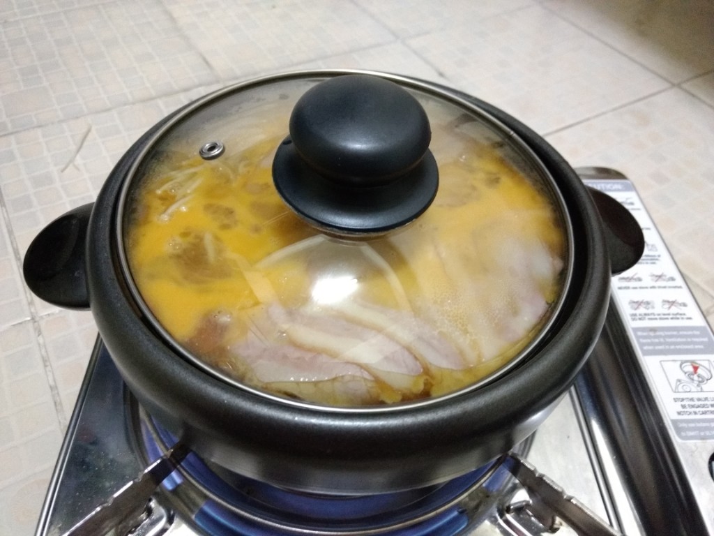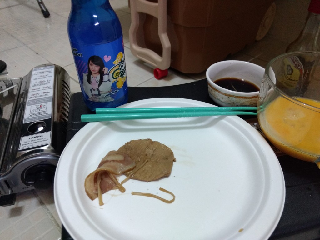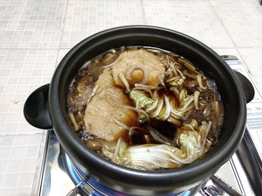 สืบเนื่องจากความขี้เกียจในวันหยุดเพราะแฟนไม่ได้ลงมากรุงเทพเลยไม่ได้ออกไปหาอะไรกินในวันหยุด ก็เลยต้องทำอาหารกินเอง(ปกติแฟนทำให้กิน) ในรอบครึ่งปีก็ลองค้นๆดูว่าพอมีอะไรเหลือในตู้เย็นบ้างก็ได้ออกมาตามนี้ หมูสไลด์จากฟู้ดแลนด์ เบค่อนจากงาน Big C เมื่ออาทิตย์ที่แล้ว ผักกาดขาวเหลือจากกินกับน้ำพริก เห็ดเข็มทองและชิเมจิ ไข่สองใบ หอมใหญ่(ขอป้าที่ตึกเอา) ก็ตัดสินใจทำเมนูสุกี้ญี่ปุ่นน้ำดำสูตรที่แม่ชอบทำเวลากินเหล้าสมัยก่อน(ปัจจุบันเลิกไปแล้ว) โดยในห้องก็มีเครื่องปรุงที่พร้อมใช้เช่น โชยู น้ำตาล เหล้า เนย และผงซุปอยู่แล้ว