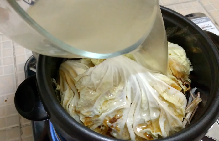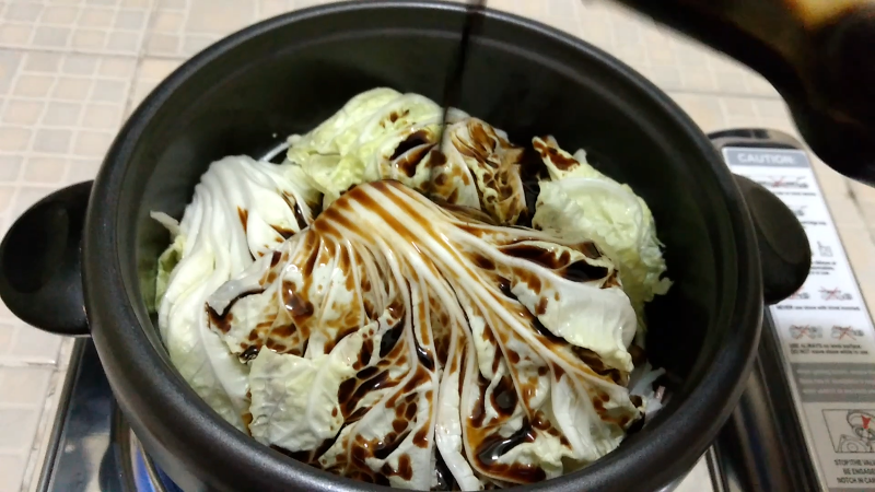 นำเห็ดและผักกาดขาววางลงทับตัวเนื้อหมูและหอมใหญ่ที่ผัดเสร็จ