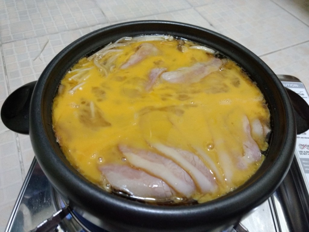 หลังจากที่กินแบบจุ่มจิ้มไปได้สักพัก ถ้าอยากกินแบบให้อิ่มโดยเอามากินกับข้าว ก็ให้น้ำผักที่เหลือลงไปแล้วก็เอาเนื้อที่เหลือวางราดไข่ลงไปให้ทั่วหม้อ