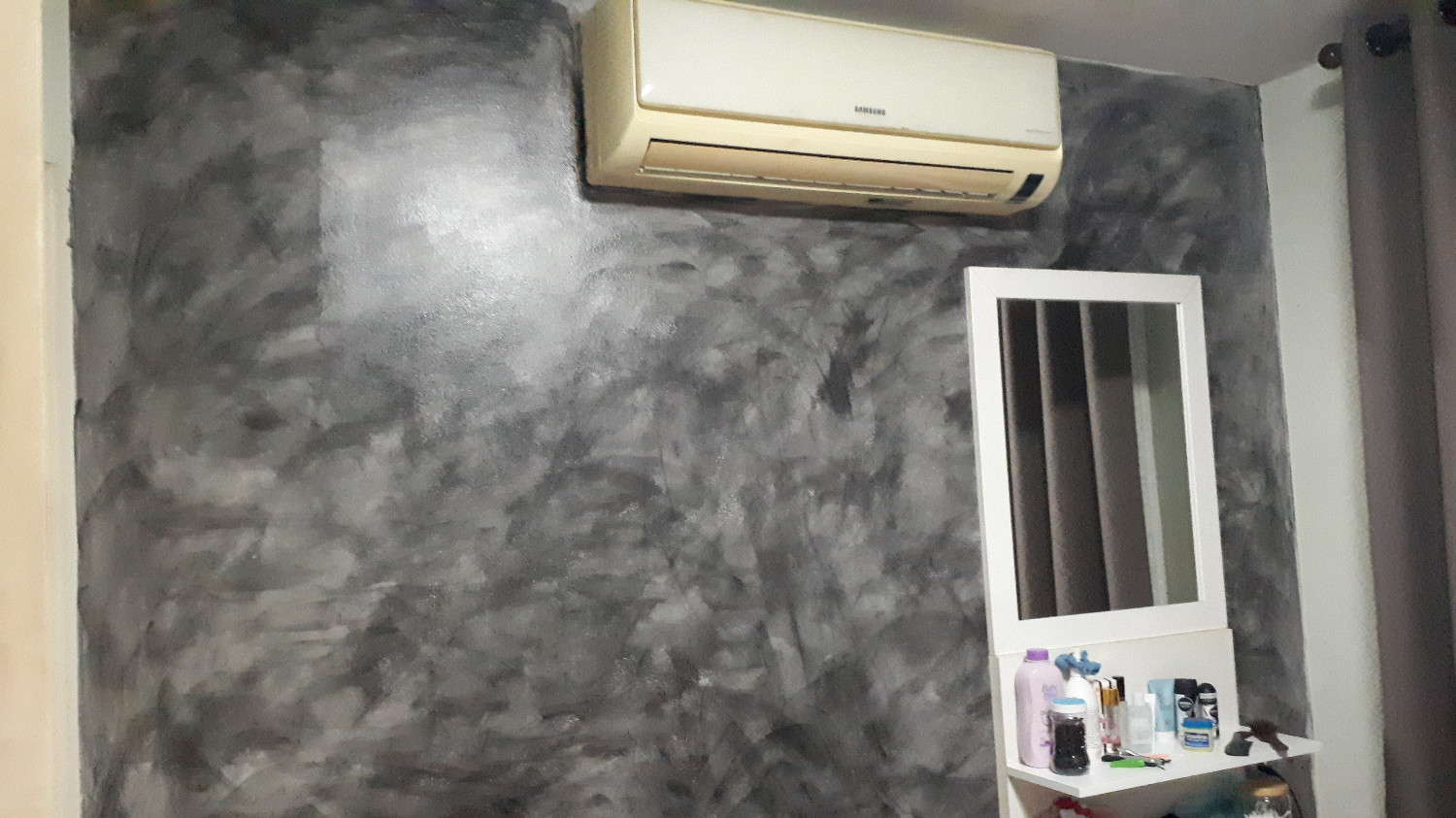 จุดเริ่มต้นของการแต่งนั้น คือการทาสี แต่ผมไม่ได้ทาทั้งห้องนะครับ (ในตอนนี้) ทาไว้แค่กำแพงด้านหนึ่งของห้องนอน และเสาต้นหนึ่งเท่านั้น ผมไปเห็นกำแพงห้องของเพื่อนที่มันทาเองเป็นลายปูนเปลือยสวยมากๆ สอบถามเลยได้ทราบว่ามันคือสี Momento Loft ไม่รอช้าครับ เดินทางไปโฮมโปรเพื่อจะซื้อมาทาเอง โดนพนักงานป้ายยามาว่าซื้อเบอร์ 3 (เข้ม) ไปเลย ถ้าอยากได้จางๆก็ทาบางๆเอา...ซึ่งผมก็เชื่อ ปรากฏว่าหลังทาเสร็จสิ่งที่ได้คือมันเข้มมาก แต่ก็ไม่เป็นไรสวยดี ตามรูปเลยครับ