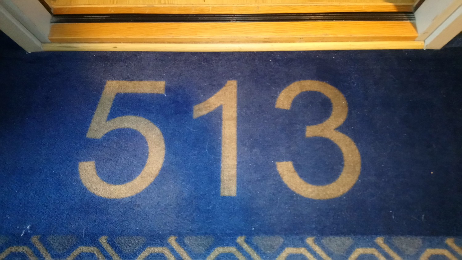 ส่วนรูปนี้ก็แปลกดีครับ คือมีโอกาสได้ไปใช้บริการของโรงแรมหนึ่งใกล้สถานีรถไฟกรุงทัลลินน์ ได้เบอร์ห้องมาพนักงานต้อนรับก็แนะนำอย่างดี ให้ขึ้นลิฟท์ไปชั้น ๕ ออกจากลิฟท์เลี้ยวซ้าย เลี้ยวขวา ก็จะถึงห้อง พอเดินตามทางก็มองประตูหาเบอร์ห้องพักไปเรื่อย ๆ ก็แปลกใจว่าไม่เห็นมีเบอร์ห้องติดที่ประตู หรือข้าง ๆ ประตู อุตส่าห์ถอดแว่นเพ่ง กราฟฟิคบนประตูคิดว่าจะซ่อนเบอร์ห้องไว้ก็ไม่มี กำลังจะหันกลับไปลงลิฟท์ถามพนักงาน สายตาก็ไปเจอเบอร์ห้อง พี่ท่านเล่นทอใส่พรมอยู่ที่พื้นเลย