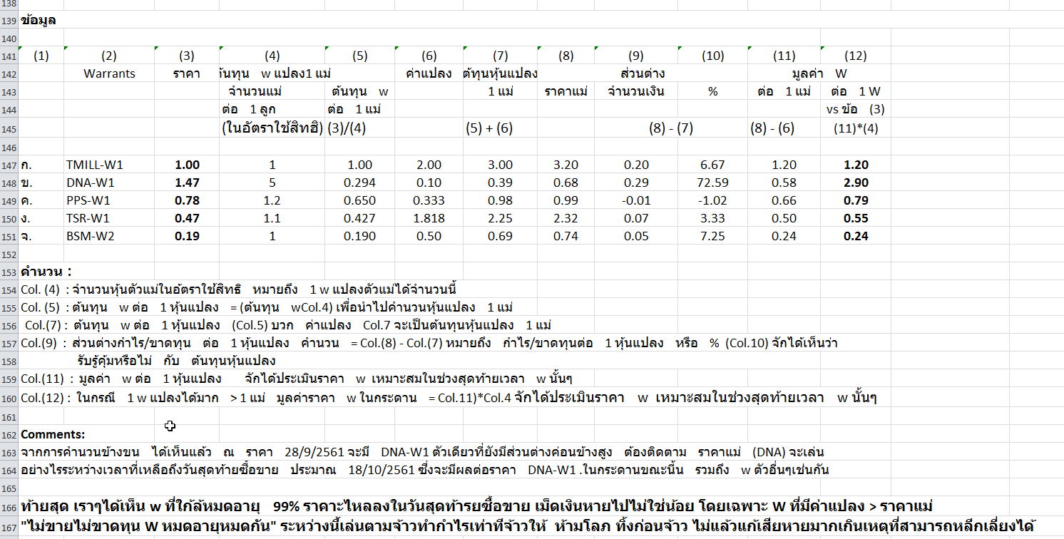A. Warrants รายชื่อ B. Waarrants ได้จบตัวเองสิ้นสุด 31/1/2562 7 warrants ได้จบบทบาทตัวเองเรียบร้อย ดั่งแสดงในรูปได้เห็นสัจธรรมความจริง มี 5 warrants ที่ค่าแปลง > ราคาแม่ จบตัวเอง 1 ตัวที่ 0.