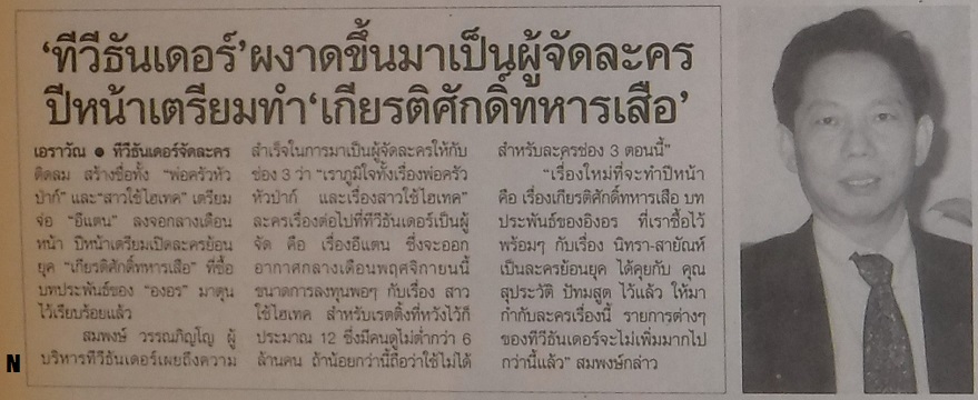 ฉันจำได้ว่า เมื่อสัก 20 ปีก่อนโน่น มีข่าวบนหน้าหนังสือพิมพ์สัก 2-3 ฉบับระบุว่า ทางช่อง 3 จะหยิบนวนิยายเรื่อง "เกียรติศักดิ์ทหารเสือ" ซึ่งเคยสร้างเป็นละครเวที และภาพยนตร์ มาปัดฝุ่นให้เป็นละครโทรทัศน์ร่วมสมัย โดยมีค่าย "ทีวีธันเดอร์" ซึ่งถนัดในการทำละครแนวหรรษามารับหน้าที่ผลิตละครเรื่องยิ่งใหญ่ นักแสดงที่ถูกวางตัวเท่าที่ฉันจำได้ก็ประมาณ โอ วรุฒ แหม่ม คัทลียา ฯลฯ แต่ต่อมาโปรเจ็กต์ดังกล่าวถูกพับไป