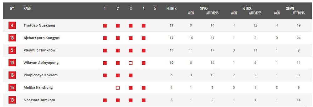 กัปตันมายู 19 แต้ม ( 17 Attack 2 Sever ) 14 Dig บอลท้ายสนามมายูเก็บเรียบ วาดะ 15 แต้ม มาจากการตบทั้งหมด ( เกือบหลับแต่กลับมาได้ในเซ็ต 5 ) 12 Dig ซาโตะ 15 แต้ม ( 13 Attack 1 Block 1 Sever ) 9 Dig แต่ว