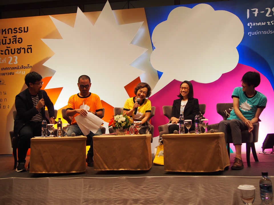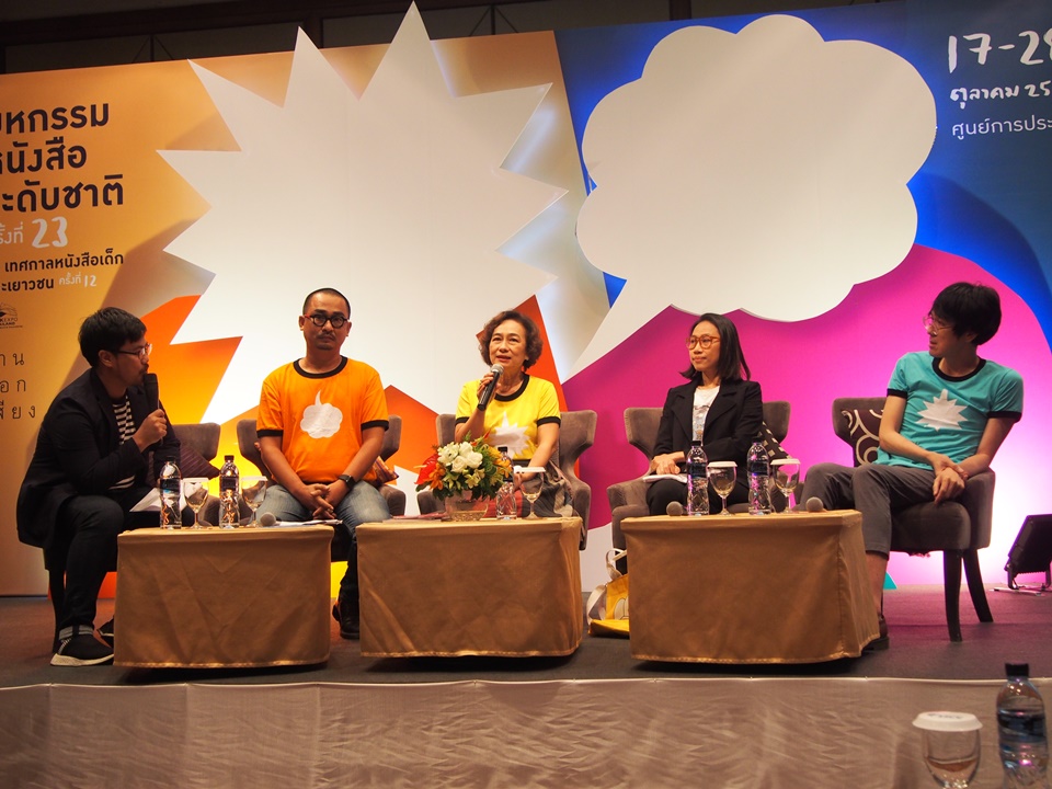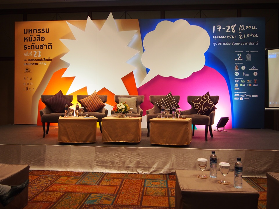ด้านเวทีเสวนาหรือเวทีเอเทรียม ก็เป็นอีกหนึ่งกิจกรรมที่ถูกจับตามองในครั้งนี้เราได้รับเกียรติจาก ศาสตราจารย์ นายแพทย์เกษม วัฒนชัย องคมนตรี ปาฐกถาพิเศษให้กับโครงการหนึ่งอ่านล้านตื่น ในหัวข้อ “การอ่านสร้างนวัตกรรม” ในวันอาทิตย์ที่ 21 ตุลาคม เวลา 11.00 น. อีกหนึ่งรายการสำคัญจากทางสมาคมผู้จัดพิมพ์ฯ คือการเสวนาในชื่อว่า “เสียงที่ไม่(เคย)ได้ยิน”ซึ่งจัดขึ้น 2 วันเริ่มจากวันที่ 18 ตุลาคมจะเป็นเวทีภาคประชาชน ผู้ร่วมเสวนาจะได้แก่เดย์ ฟรีแมน นักแสดงนางโชว์ตัวแม่และนักอ่านตัวยงบังเจ๊ะหัน ยะลา ชาวบ้านจากกระบี่ ผู้พลิกชีวิตจากศูนย์เป็นล้านด้วยความรู้จากการอ่าน พลอย – สโรชากิตติสิริพันธุ์ นักเขียนผู้ดวงตาพิการ เจ้าของวรรณกรรมเยาวชน“จนกว่าเด็กปิดตาจะโต” อักษรศาสตร์บัณฑิตเกียรตินิยมอันดับหนึ่ง จากจุฬาลงกรณ์มหาวิทยาลัย และจิดานันท์เหลืองเพียรสมุท นักเขียนซีไรต์ที่อายุน้อยที่สุด และวันศุกร์ที่19ตุลาคม จะเป็นเวทีภาคการเมือง ซึ่งจะมีพรรคการเมืองต่างๆ ส่งผู้แทนเข้าร่วมเสวนาแนวคิดและความเห็นเกี่ยวกับหนังสือและการอ่านในประเทศไทยจากมุมมองของนักการเมือง โดยทั้งสองวันจะเริ่มเวลา 17:00 – 19:00 น. นอกเหนือจากนี้ ยังจะมีการเสวนาและการเปิดตัวหนังสือใหม่ จากผู้มีชื่อเสียง อาทิ ท่าน ว วชิรเมธี/ศาสตราจารย์พิเศษ ธงทอง จันทรางศุ/ ดร. มีชัย วีระไวทยะ/ น้าเน็ก เกตุเสพย์สวัสดิ์ ปาลกะวงศ์ ณ อยุธยา/ ธนาธร จึงรุ่งเรืองกิจ/ ทนายษิทรา เบี้ยยังเกิด และ ยืนยง โอภากุล (แอ๊ด คาราบาว) ที่มากับ อาเลย์ดา เกวารา บุตรสาวคนโตของเช เกวาราบินตรงจากคิวบา เพื่อร่วมงานมหกรรมหนังสือครั้งนี้ สามารถตรวจสอบรายละเอียดการเสวนาและกำหนดการเวทีเสวนาได้จาก www.facebook.com/Bookthai