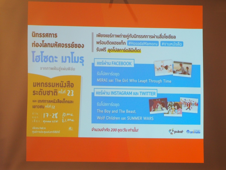 “นิทรรศการท่องโลกมหัศจรรย์ของ HOSODA MAMORU… จากภาพฝันสู่แผ่นฟิล์ม” นิทรรศการระดับโลกที่ผ่านการจัดแสดงทั้งใน กรุงปารีส เซี่ยงไฮ้ โตเกียว และไทเป และส่งตรงมางานมหกรรมหนังสือที่ กรุงเทพฯ โดยนำภาพสเก็ตช์และสตอรี่บอร์ดจริงของ Hosoda Mamoru (โฮโซดะมาโมรุ) ผู้กำกับภาพยนตร์อนิเมะชื่อดังและผลงานที่นำมาจัดแสดงในนิทรรศการครั้งนี้ล้วนมาจากภาพยนตร์ของเขาที่เข้าฉายในประเทศไทย และได้รับการตีพิมพ์เป็นนิยายและหนังสือการ์ตูนในฉบับภาษาไทยอีกด้วย